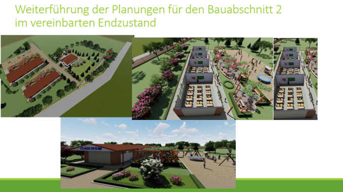 Wir sammeln weiter Spenden. Wenn auch künftig genügend Spenden eingehen, kann ein 2. Bauabschnitt für ein weiteres Schulgebäude starten. Die vorhandene Planung kann optimiert werden und es ist keine neue Ausschreibung und keine erneute Einrichtung der Baustelle nötig. Benötigt werden hierfür ca. 70.000 EUR.